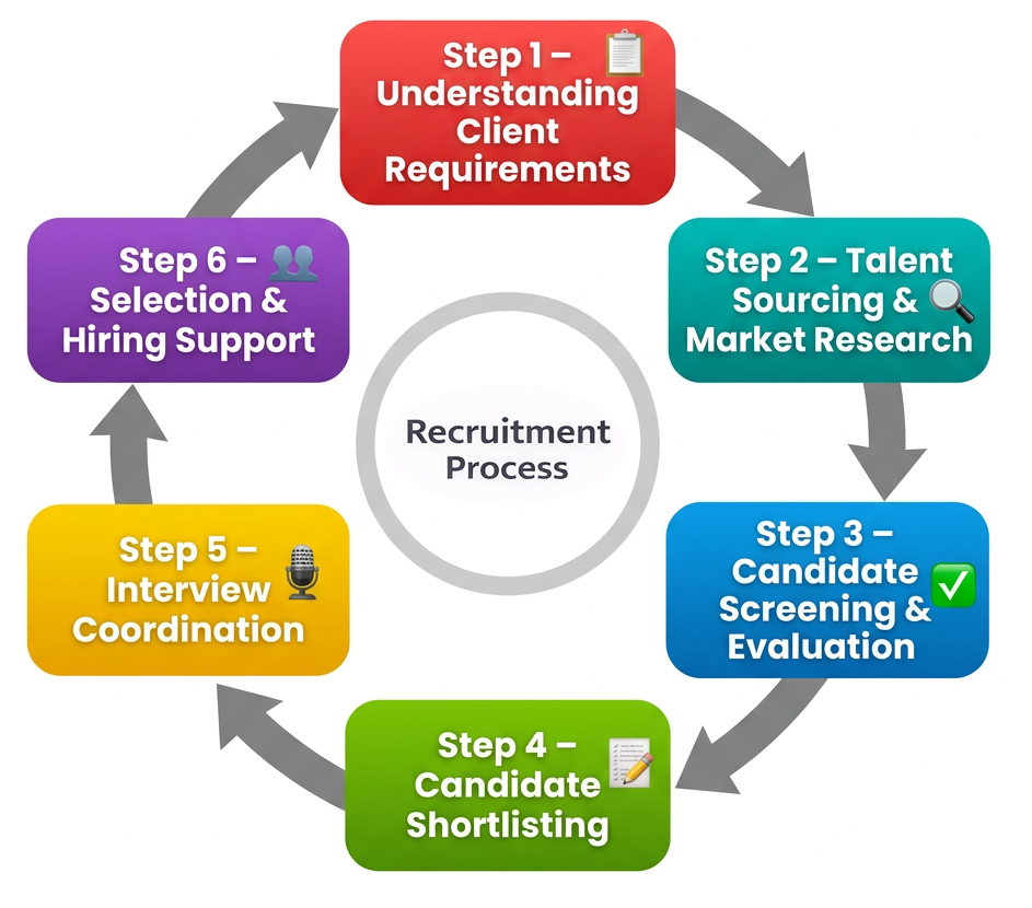 Step 6 – Selection & Hiring Support: Once the client selects a candidate, we assist in completing the hiring process by coordinating final discussions, offer communication, and onboarding support where required.